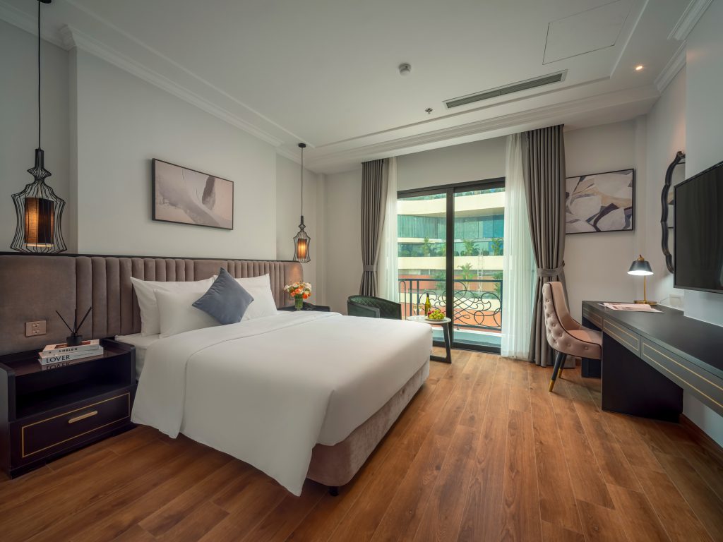 • Thiết kế tinh tế: Mỗi căn phòng tại khách sạn đều được thiết kế tỉ mỉ, kết hợp hài hòa giữa phong cách hiện đại và nét đẹp truyền thống, mang đến không gian sống ấm cúng và tiện nghi.